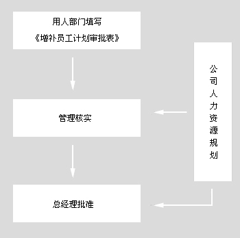 天作出《增补用工计划审批表》表二)制定,提交管理部;管理部核实后作出人员增补方案,报请总经理批准,办理录用事宜。
