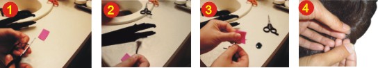 2. 首先将头发分成V字型,然后根据已设计好的发型从一侧开始将头发挑少许进行黏接。黏接前要先把即将接上去的头发剪齐,也可以一根一根嫁接。